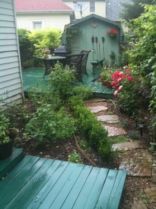 Once completed we stained the wood with an outside Benjamin Moore green wood stain – its time to recoat the stain.