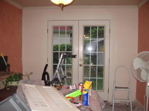 The ceiling was covered in ‘popcorn’ which was removed, a wooden cornice was added, windows were replaced, and the ceiling was painted white to provide more light. The walls were painted in sea blue. We did include a ceiling fan as this reduces our A/C usage and circulates the air.
