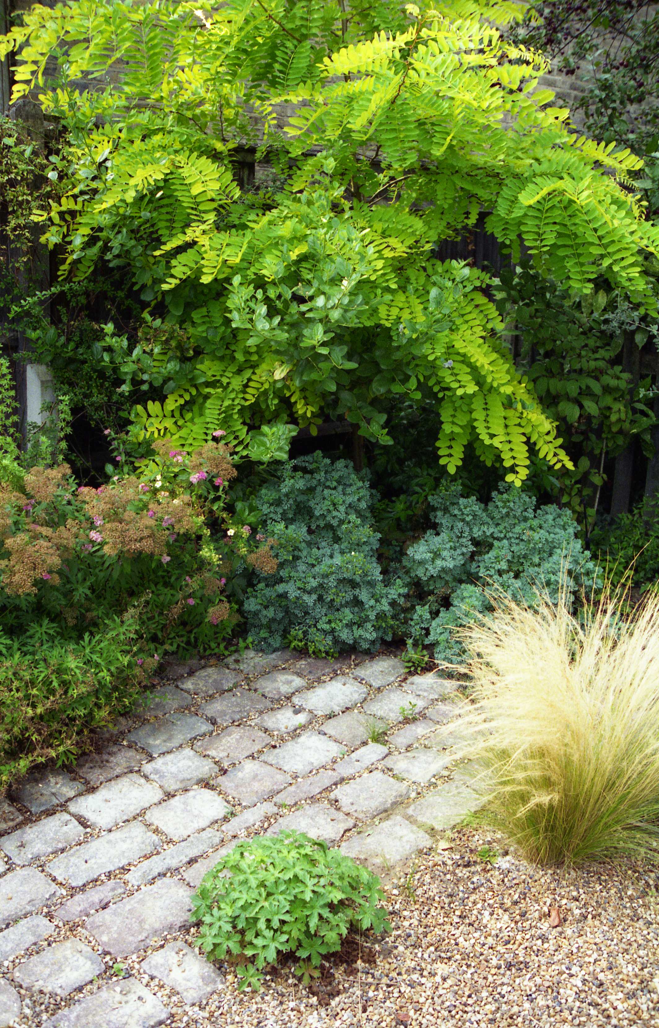 Finally, if you want very low maintenance, it’s best to stick to hard surfaces, like this granite sett pathway..